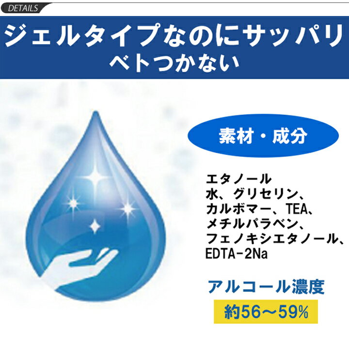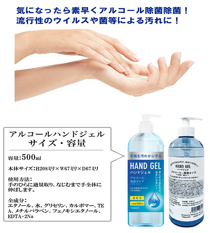 ●成分● エタノール、水、グリセリン、カルボマー、TEA メルチパラペン、フェノキシエタノール、EDTA-2Na ○アルコール配合率:56%〜59% ○サイズ(約):H208xW67xD67mm ○容量(約):500ml×12本 ○生産国:中国 【使用上のご注意】 ●お肌に異常が生じていないかよく注意して使用してください。